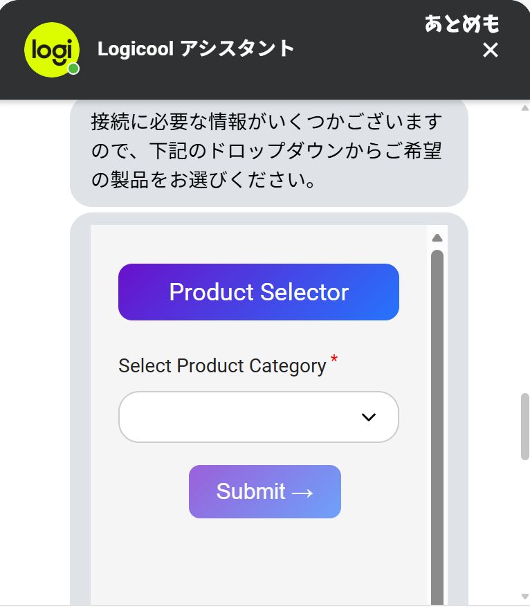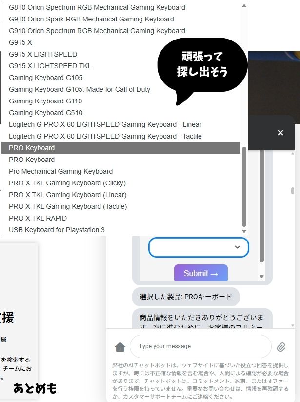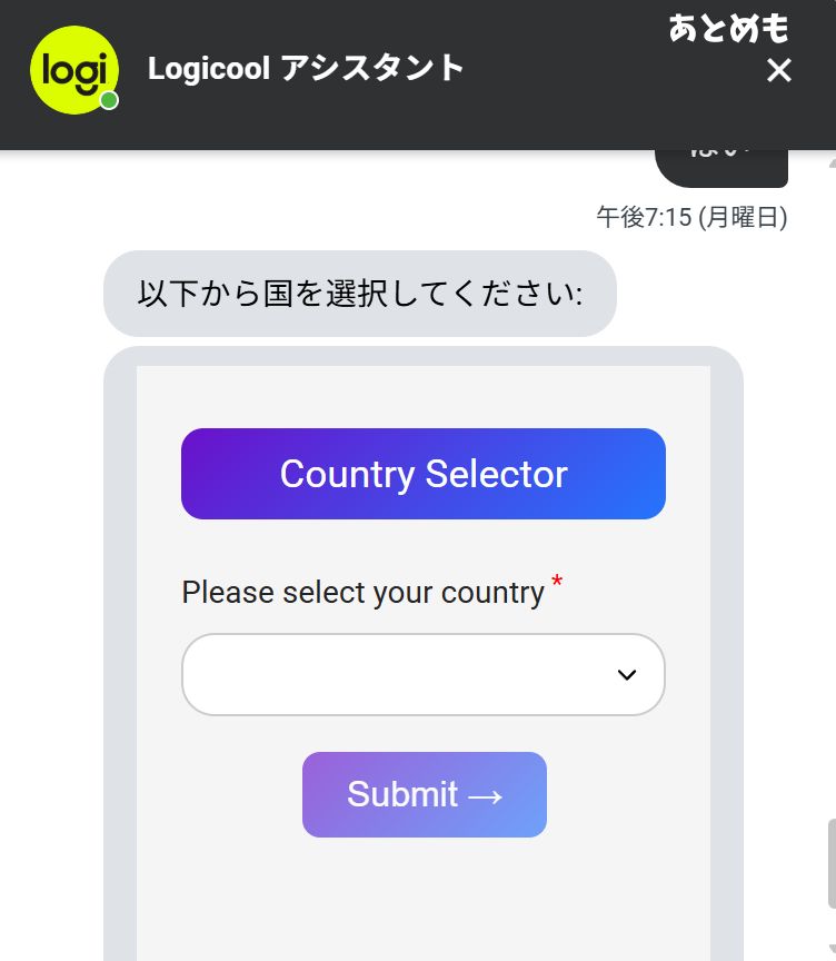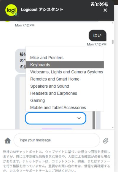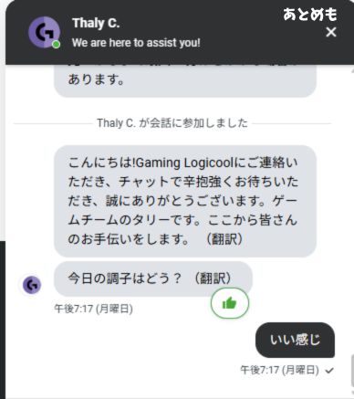 ロジクールのページについたら右下のコメントマークを押します。