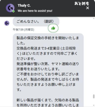 発送して交換品が届くまで約4日発送の手続きに関するチャットがとどいてから製品が届くまで